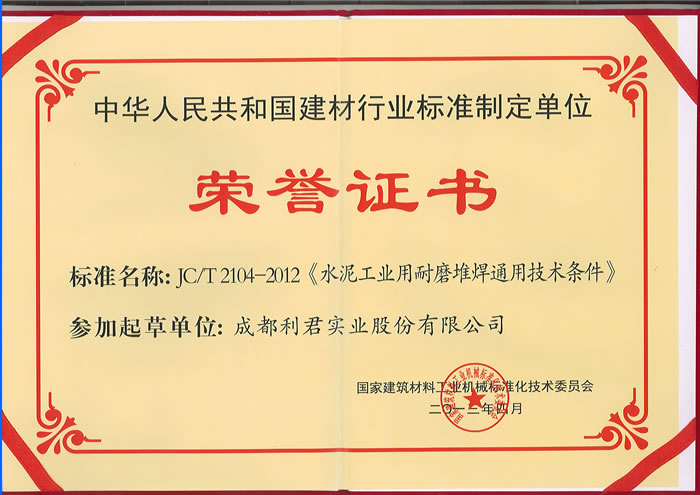 我公司榮獲“中華人民共和國(guó)建材行業(yè)標(biāo)準(zhǔn)制定單位榮譽(yù)證書”、常務(wù)副總經(jīng)理徐智平先生獲得“JCT2104-2012《水泥工業(yè)用耐磨堆焊通用技術(shù)條件》行業(yè)標(biāo)準(zhǔn)起草人榮譽(yù)證書”、項(xiàng)目經(jīng)理鄧四文先生被評(píng)為2012年度建材機(jī)械行業(yè)標(biāo)準(zhǔn)化先進(jìn)工作者。